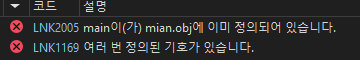 함수란 기능을 수행하는 코드 단위를 말한다. C언어에서는 여러 함수를 만들지만 main함수는 꼭 하나만 있어야 한다. 폴더 안에 여러 C언어 프로젝트 파일을 만들었다고 가정을 하자. 그 파일 마다 main함수를 만들면 어떻게 될 까? 컴파일 과정에서 아래 사진처럼 오류가 발생했다고 경고문?이 나온다